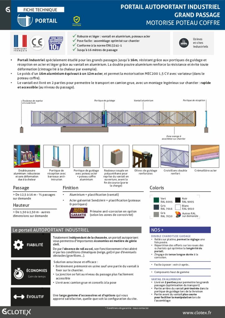 | Matière | Aluminium (ventail) ; Acier galvanisé Sendzimir® (portique et poteau) |