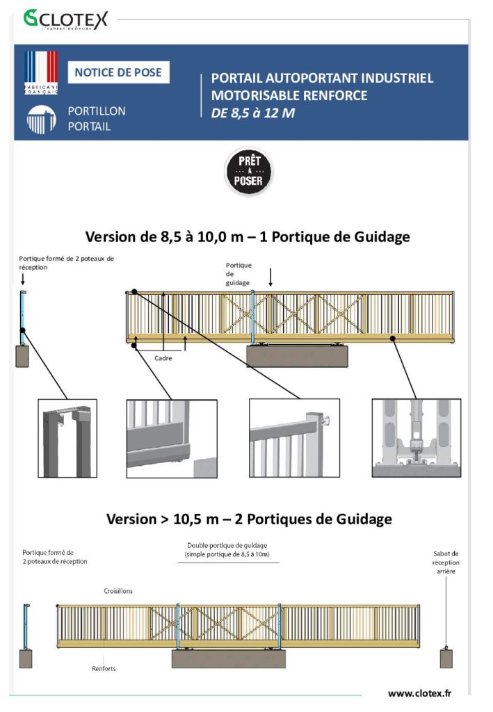 | Versions renforcées | - Passages de 8,5 à 10m motorisable : version renforcée avec croisillons en option - Passages 10,5 à 12m motorisable : version renforcée en standard avec croisillons et double portique de guidage |