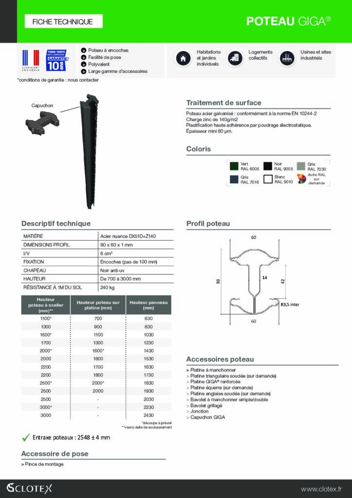 Pose simple grâce aux encoches et aux différents accessoires associés : Platine à manchonner, platine triangulaire soudée, platine Giga® renforcée, platine équerre, platine anglaise soudée, bavolet simple ou double, bavolet grillagé, jonction, capuchon Giga®, kit d’occultation ZeKit®, dalle de soubassement.